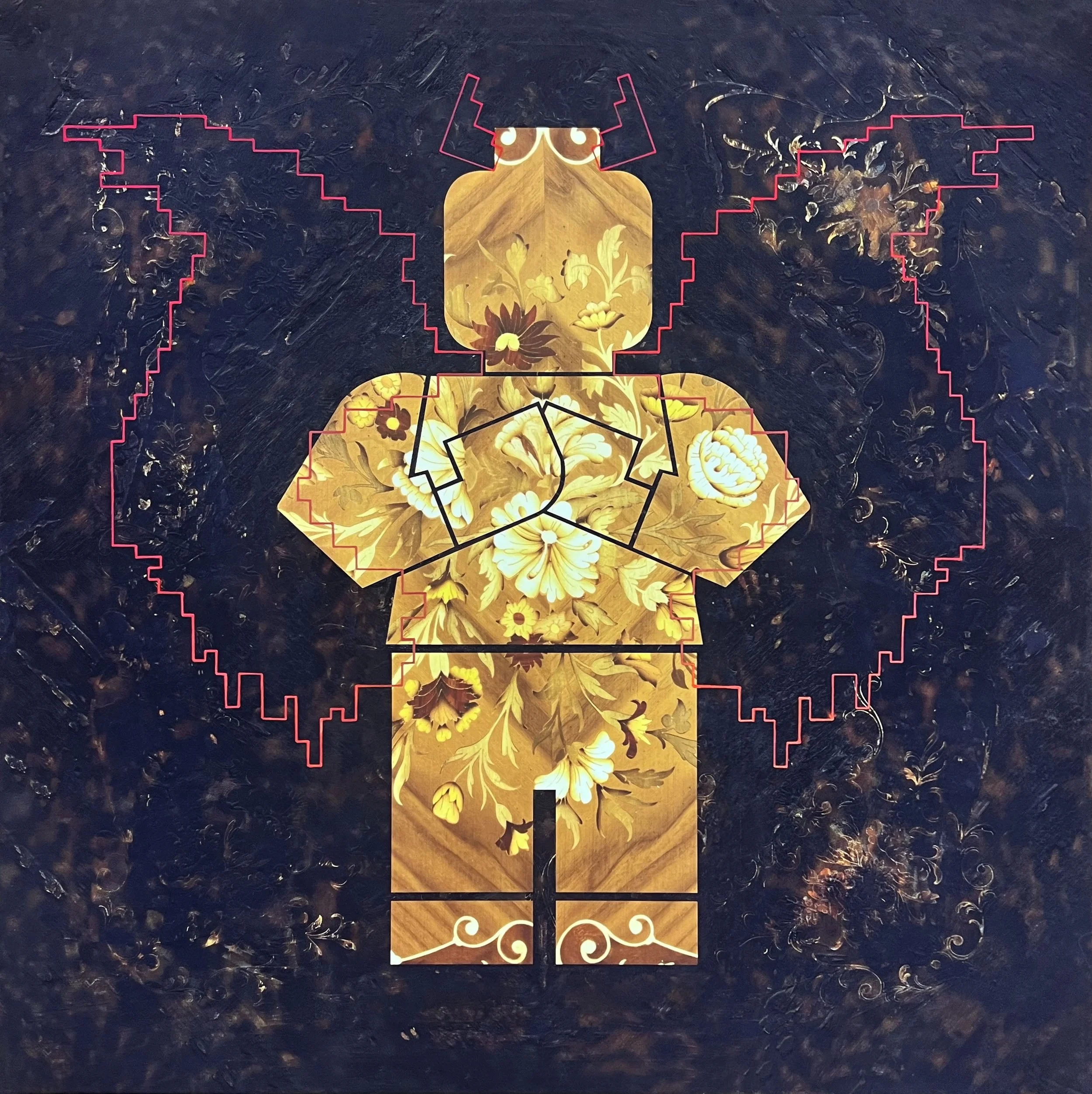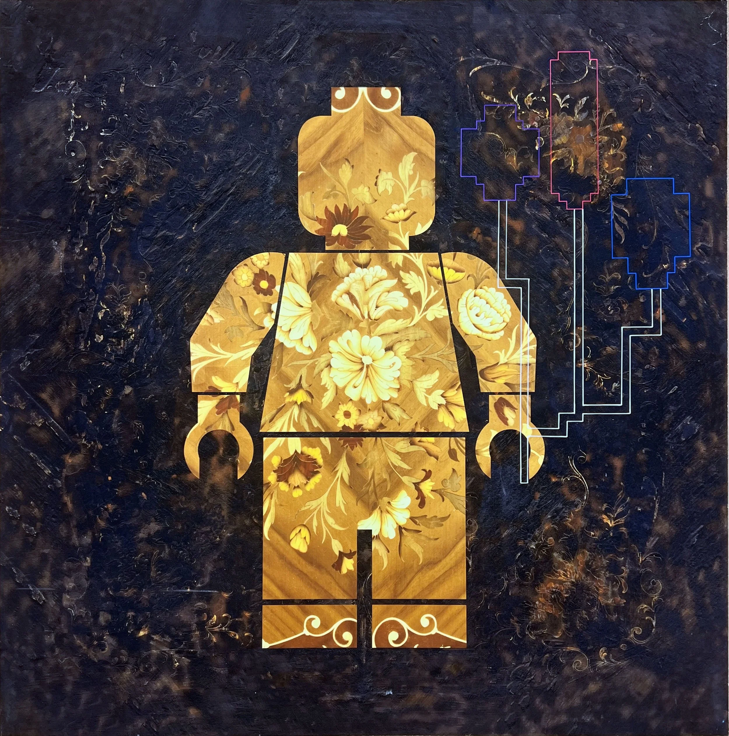 Keeping it 2 dimensional the Lego of the sculptures series is replaced by a painted line. Outlining the Lego form whilst allowing the burnt marquetry background to show through.