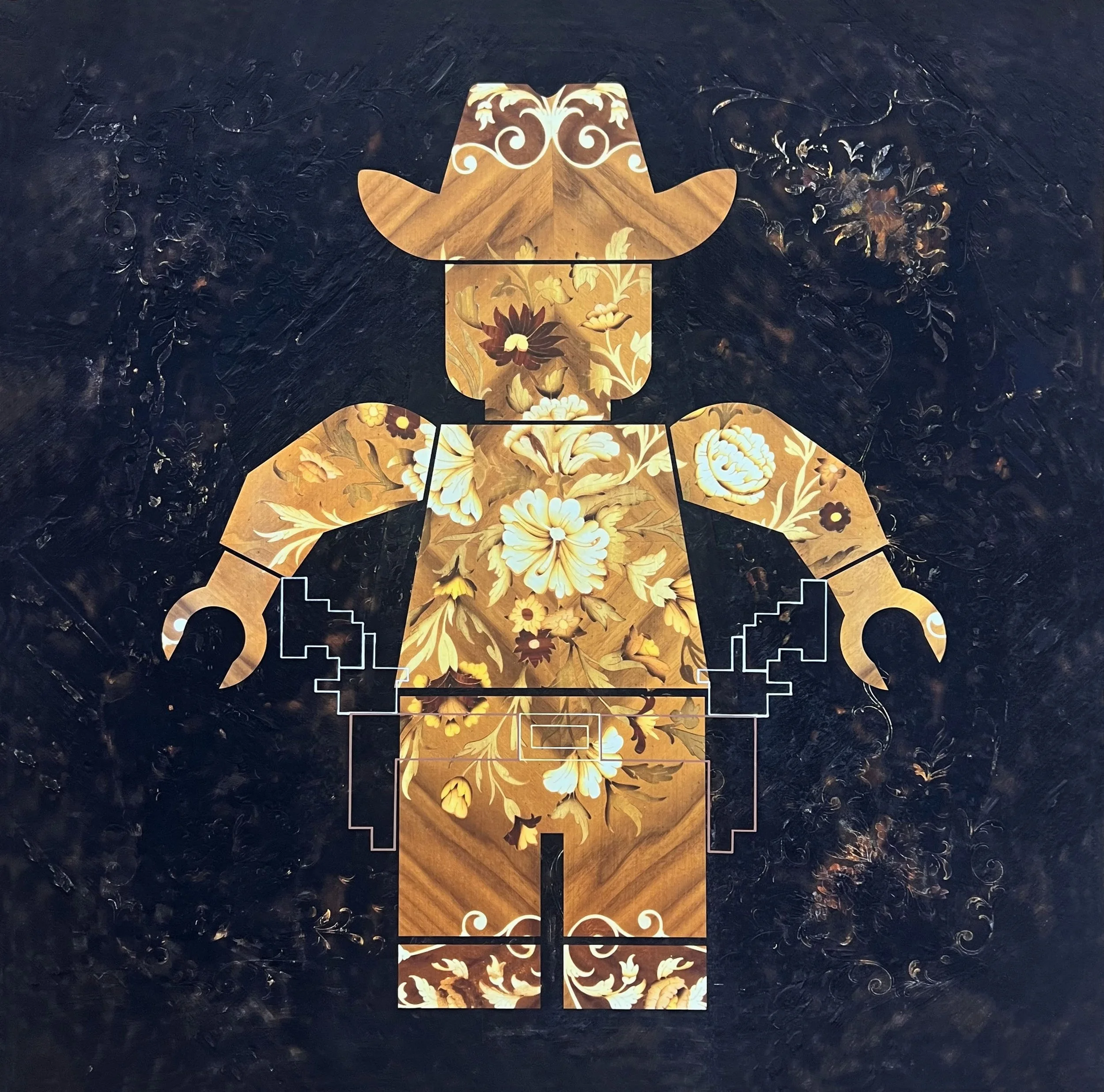 “Ironically the original marquetry piece was made in the era of the cowboy. Now the tools of his trade come from the world he’s alienated from.”